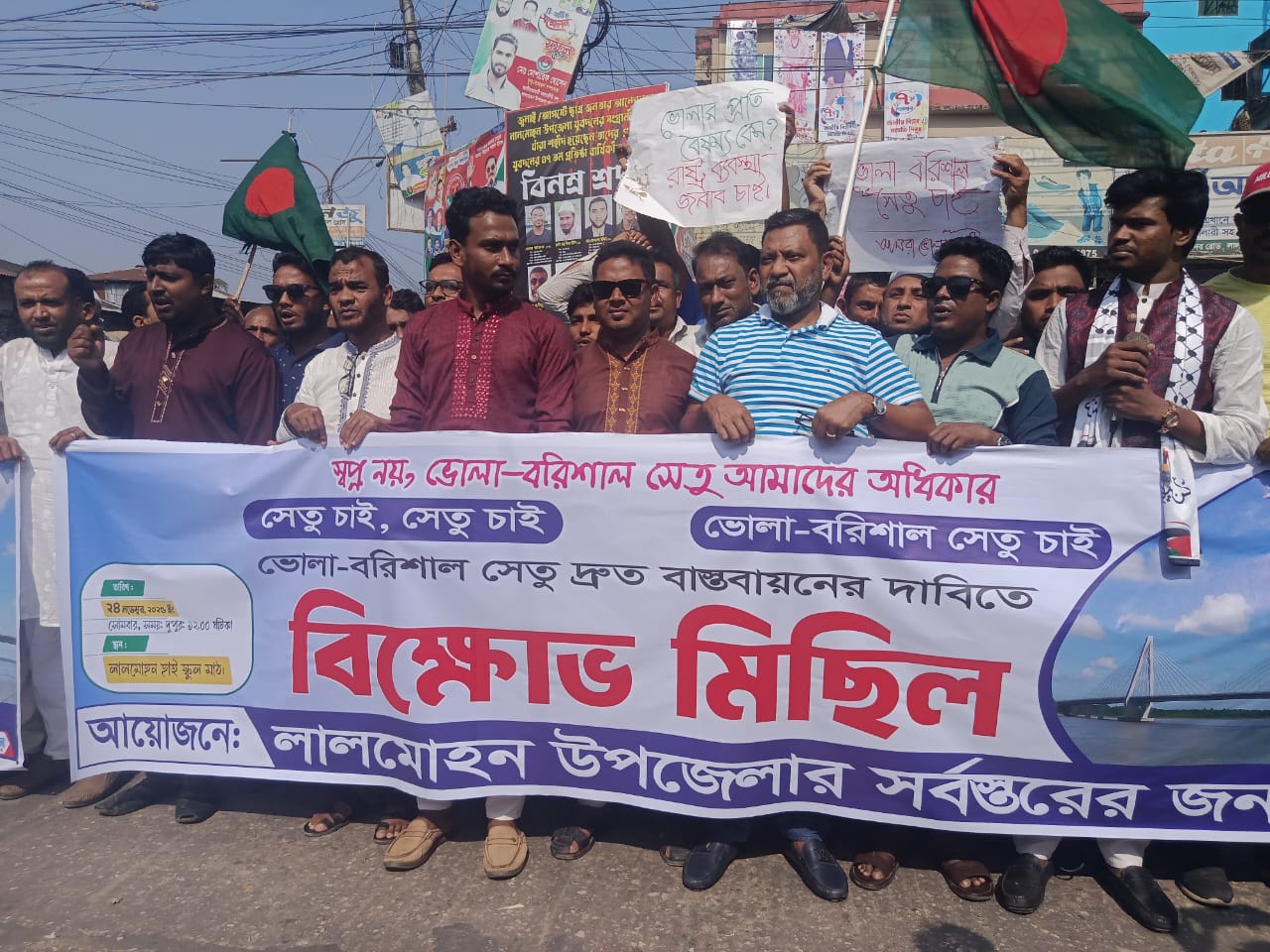 লালমোহন (ভোলা) প্রতিনিধি: স্বপ্ন নয়, ভোলা- বরিশাল সেতু আমাদের অধিকার এই প্রতিপাদ্যে ভোলা–বরিশাল সেতু নির্মাণের দাবিতে লালমোহনে রাজনৈতিক ব্যক্তিবর্গ, শিক্ষার্থী ও সাধারণ মানুষের অংশগ্রহণে মানববন্ধন ও বিক্ষোভ মিছিল অনুষ্ঠিত হয়েছে।