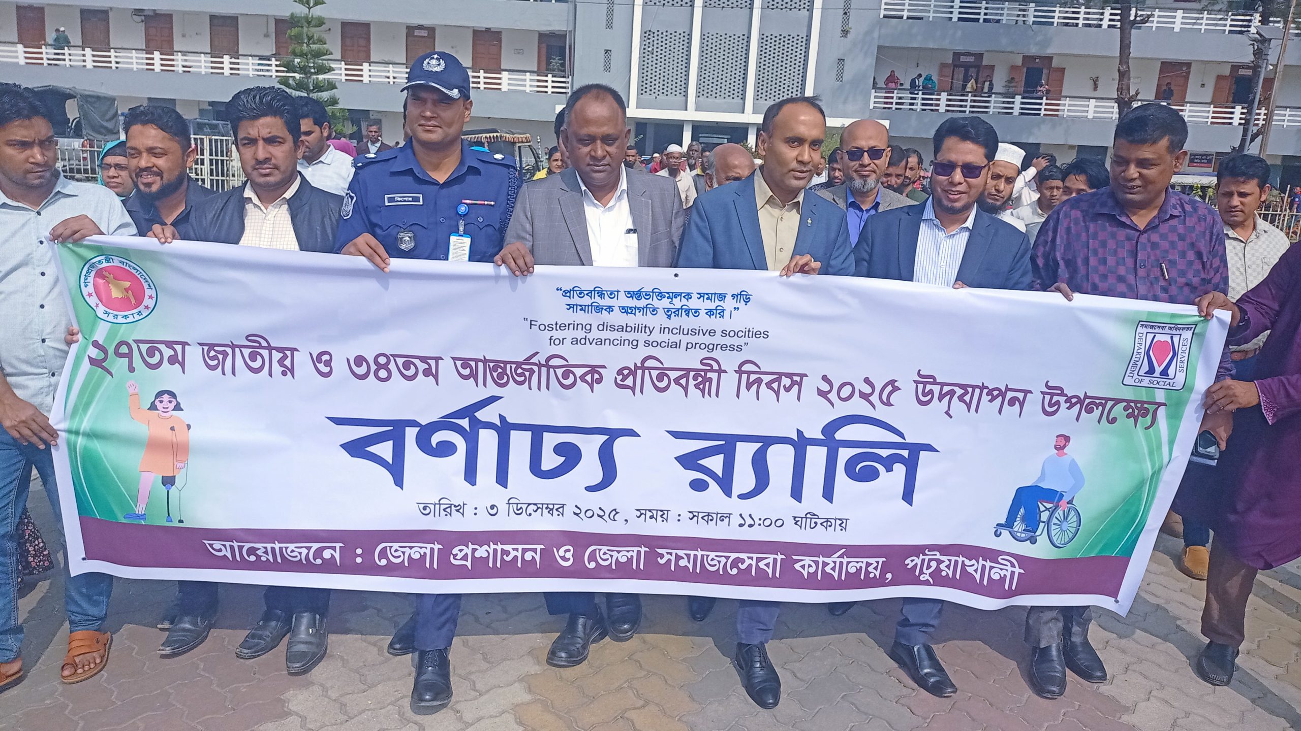 ‘‘প্রতিবন্ধীতা অর্ন্তভুক্তিমূলক সমাজ গড়ি, সামাজিক অগ্রগতি ত্বরান্বিত করি’’ এ প্রতিপাদ্য নিয়ে পটুয়াখালীতে বর্ণাঢ্য র্যালী, আলোচনা সভা ও হুইল চেয়ার, ট্রাই সাইকেলসহ বিভিন্ন উপকরণ বিতরন কর্মসূচীর মধ্য দিয়ে পালিত হয়েছে ২৭ তম জাতীয় ও ৩৪ তম আর্ন্তজাতিক প্রতিবন্ধী দিবস-২০২৫।