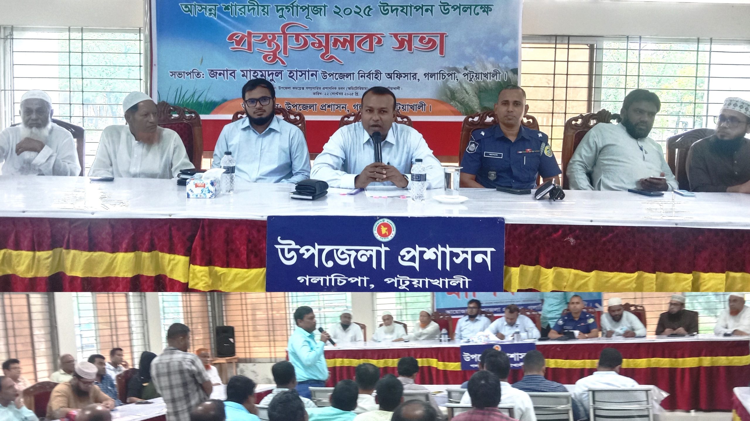 মু. খালিদ হোসেন মিল্টন, গলাচিপা: আসন্ন সনাতন ধর্মবলম্বীদের সবচেয়ে বড় ধর্মীয় উৎসব দুর্গা পূজা আনন্দ, উৎসব এবং শান্তি শৃঙ্খলায় অনুষ্ঠিত হওয়ার লক্ষ্যে গলাচিপা উপজেলা প্রশাসন এর আয়োজনে উপজেলার ত্রিশ (৩০)টি পূজা মন্ডপের সভাপতি, সাধারণ সম্পাদক, রাজনৈতিক নেতৃবৃন্দ, সকল সরকারি কর্মকর্তা ও আইন শৃঙ্খলা বাহিনীর প্রতিনিধিদের সমন্বয়ে সোমবার বেলা ১১টা ৩০ মিনিটে উপজেলা অডিটরিয়াম হলে এবং বিশেষ দুর্গা পূজার প্রস্তুতি এবং মাসিক আইন শৃঙ্খলা সভা অনুষ্ঠিত হয়। বর্তমান অন্তর্বর্তীকালীন সরকারের নির্দেশাবলি এবং জেলা প্রশাসকের সিদ্ধান্ত মোতাবেক সভায় উপজেলা নির্বাহী অফিসার ও বিজ্ঞ নির্বাহী ম্যাজিস্ট্রেট মাহমুদুল হাসান এর সভাপতিত্বে শারদীয় দুর্গা পূজা উৎযাপনে বিভিন্ন সমস্যা উত্তরণে পূজা কমিটির সদস্য ও পূজা উৎযাপন পরিষদের প্রতিনিধিরা পূজা চলাকালীন সময়ে সার্বিক নিরাপত্তার ব্যবস্থা গ্রহণ করায় প্রশাসনের প্রতি সন্তোষ প্রকাশ করে।
