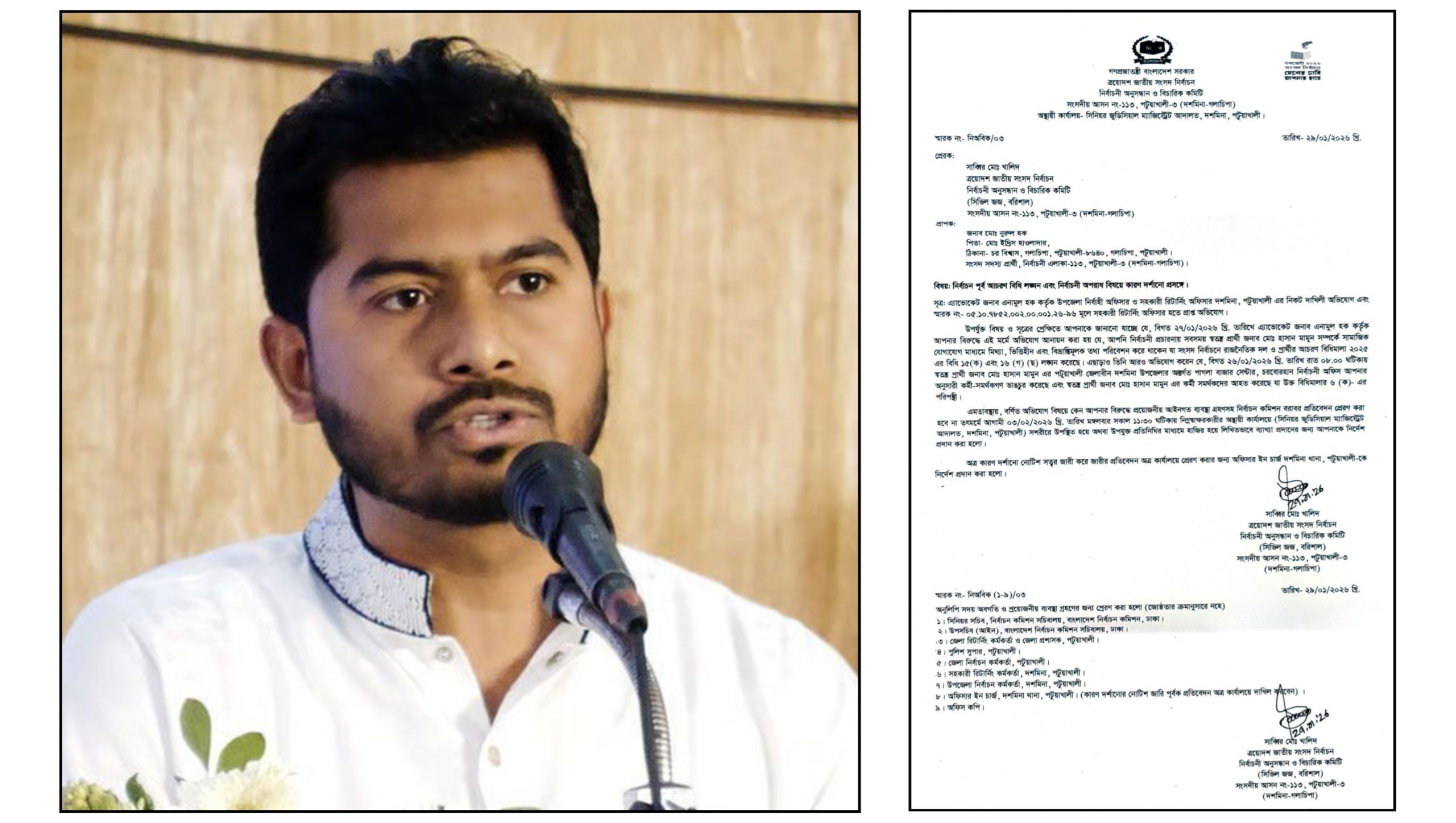 বর্ণিত অভিযোগ বিষয়ে কেন আপনার (নুরুল হক) বিরুদ্ধে প্রয়োজনীয় আইনগত ব্যবস্থা গ্রহণসহ নির্বাচন কমিশন বরাবর প্রতিবেদন প্রেরণ করা হবে না এ বিষয়ে আগামী ৩ ফেব্রুয়ারি মঙ্গলবার সকাল সাড়ে ১১ টায় সিনিয়র জুডিসিয়াল ম্যাজিস্ট্রেট আদালত, দশমিনা, পটুয়াখালী সশরীরে উপস্থিত হয়ে অথবা উপযুক্ত প্রতিনিধির মাধ্যমে হাজির হয়ে লিখিতভাবে ব্যাখ্যা প্রদানের জন্য আপনাকে নির্দেশ।