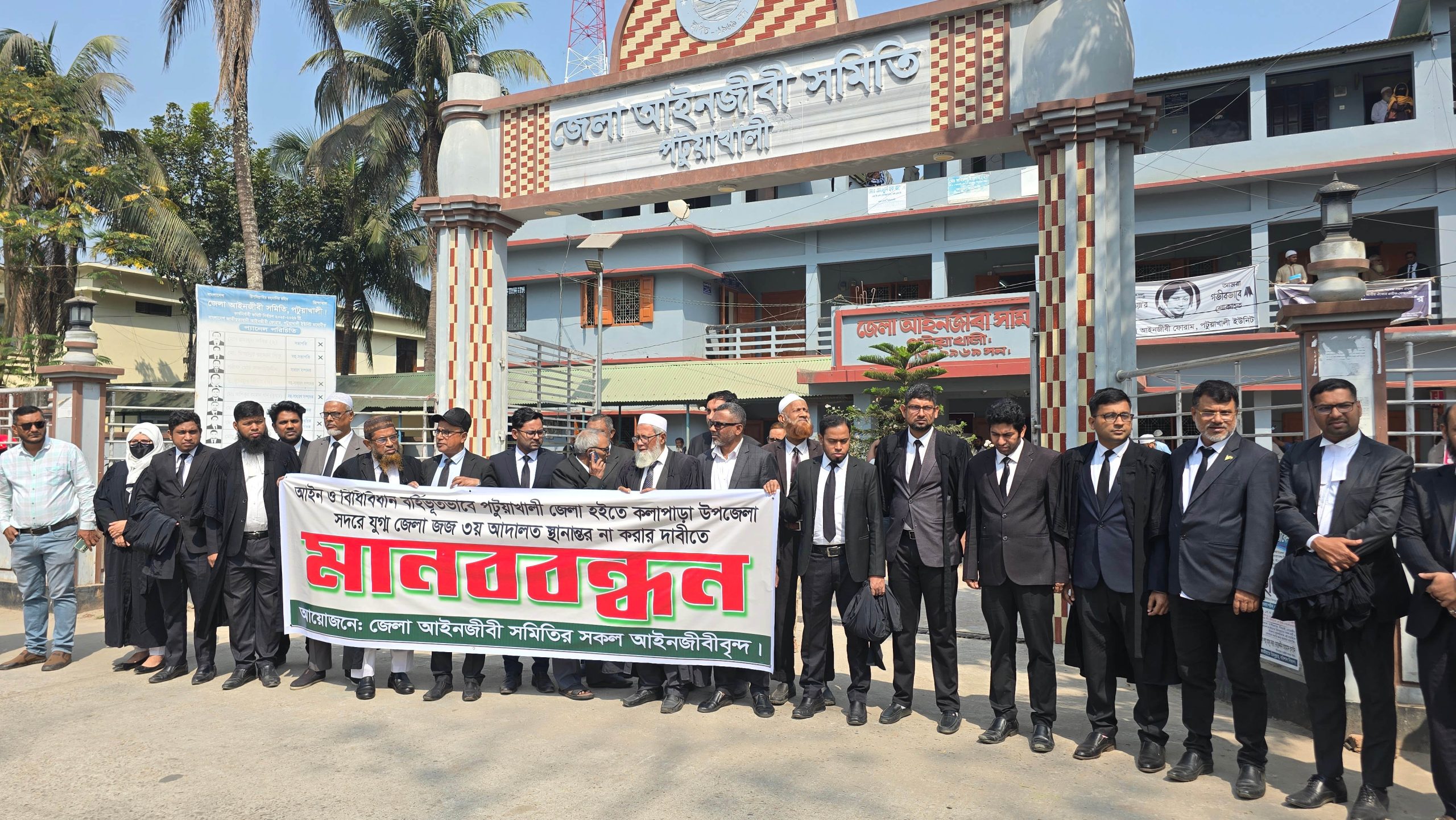 আইন ও বিধিবহির্ভূতভাবে পটুয়াখালী জেলা থেকে কলাপাড়া উপজেলা শহরে যুগ্ম জেলা জজ তৃতীয় আদালত স্থানান্তরের সিদ্ধান্তের প্রতিবাদে মানববন্ধন কর্মসূচি পালন করেছেন আইনজীবীরা।