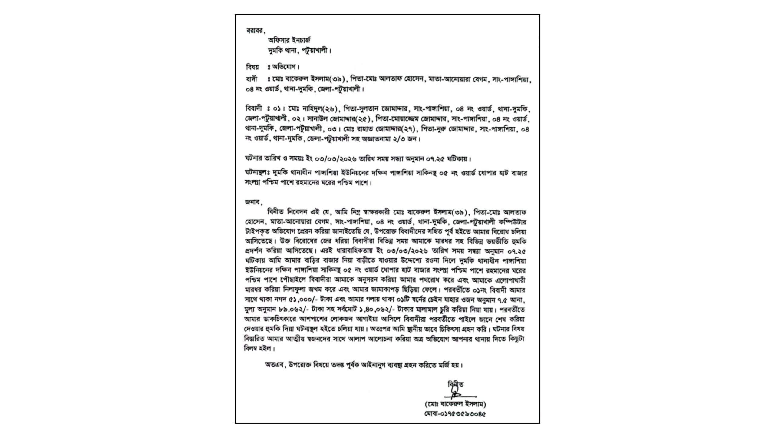 অভিযোগ সূত্রে জানা যায়, দক্ষিণ পাঙ্গাশিয়ার ৪ নম্বর ওয়ার্ডের বাসিন্দা মোঃ বাকেরুল ইসলাম (৩৯) গতমঙ্গলবার (৩ মার্চ) সন্ধ্যা সাড়ে ৭টার দিকে ধোপার হাট বাজার থেকে বাড়ি ফেরার পথে একই এলাকার নাহিদুল (২৬), সানাউল জোমাদ্দার (২৫), মোঃ রাহাত জোমাদ্দার (২৭)সহ ৫/৬জন দুবৃত্ত তাকে এলোপাতাড়ি মারধর করে তার সঙ্গে থাকা নগদ ৫১ হাজার টাকা ও ৭.৫ আনা ওজনের একটি স্বর্ণের চেইন ছিনিয়ে নেয়।