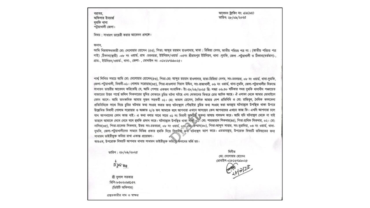 গণদাবী রিপোর্ট: পটুয়াখালীর দুমকিতে চুরির সংবাদ সংগ্রহ করতে গিয়ে সাংবাদিককে হুমকি দিয়েছে উপজেলা ছাত্রদলের সদ্য বহিষ্কৃত আহ্বায়ক চাকলাদার গোলাম সরোয়ার। এ ঘটনায় প্রেসক্লাব দুমকির সভাপতি সাংবাদিক মো. দেলোয়ার হোসেন দুমকি থানায় একটি সাধারণ ডায়েরি (জিডি) করেছেন।