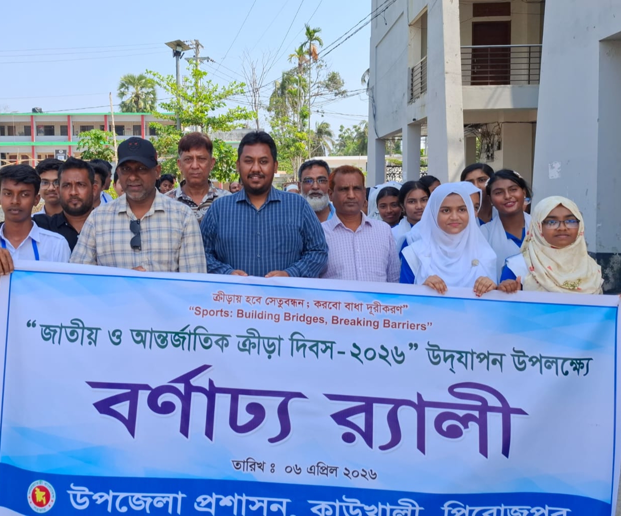 কাউখালী (পিরোজপুর) প্রতিনিধি: ক্রীড়ায় হবে সেতুবন্ধন, করবো বাধা দূরীকরণ এই প্রতিপাদ্যকে সামনে রেখে জাতীয় ও আন্তর্জাতিক ক্রীড়া দিবস উপলক্ষে সোমবার (৬ এপ্রিল) সকাল সাড়ে দশটায় পিরোজপুরের কাউখালী উপজেলা প্রশাসনের আয়োজনে, বিভিন্ন শিক্ষা প্রতিষ্ঠানের শিক্ষার্থী, বিভিন্ন দপ্তরের কর্মকর্তা ও গন্যমান্য ব্যক্তিদের নিয়ে উপজেলা চত্বর থেকে এক বর্ণাঢ্য শোভাযাত্রা বের হয়।