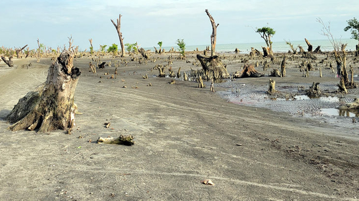 কুয়াকাটা সৈকতের কোলঘেঁষা সবুজের দীর্ঘ আস্তরণ এখন আর নেই। এখন সব ধূসর,বিবর্ণ হয়ে আছে। খাঁ খাঁ করছে। হাজার হাজার মরা গাছের গোড়া স্বাক্ষী হয়ে পড়ে আছে। বনাঞ্চল যেটুকু অবশিষ্ট আছে তাও ফি-বছর সাগরের উত্তাল ঢেউ ভাসিয়ে নিচ্ছে। বর্ষার ছয় মাস প্রত্যেক অমাবস্যা-পূর্ণিমার তিথিতে অস্বাভাবিক জোয়ারের তান্ডব উপড়ে ফেলে হাজারো গাছপালা। মৃত শত শত গাছগুলো কঙ্কালের মতো পড়ে থাকে। একসময় চুরি হয়ে যায়।