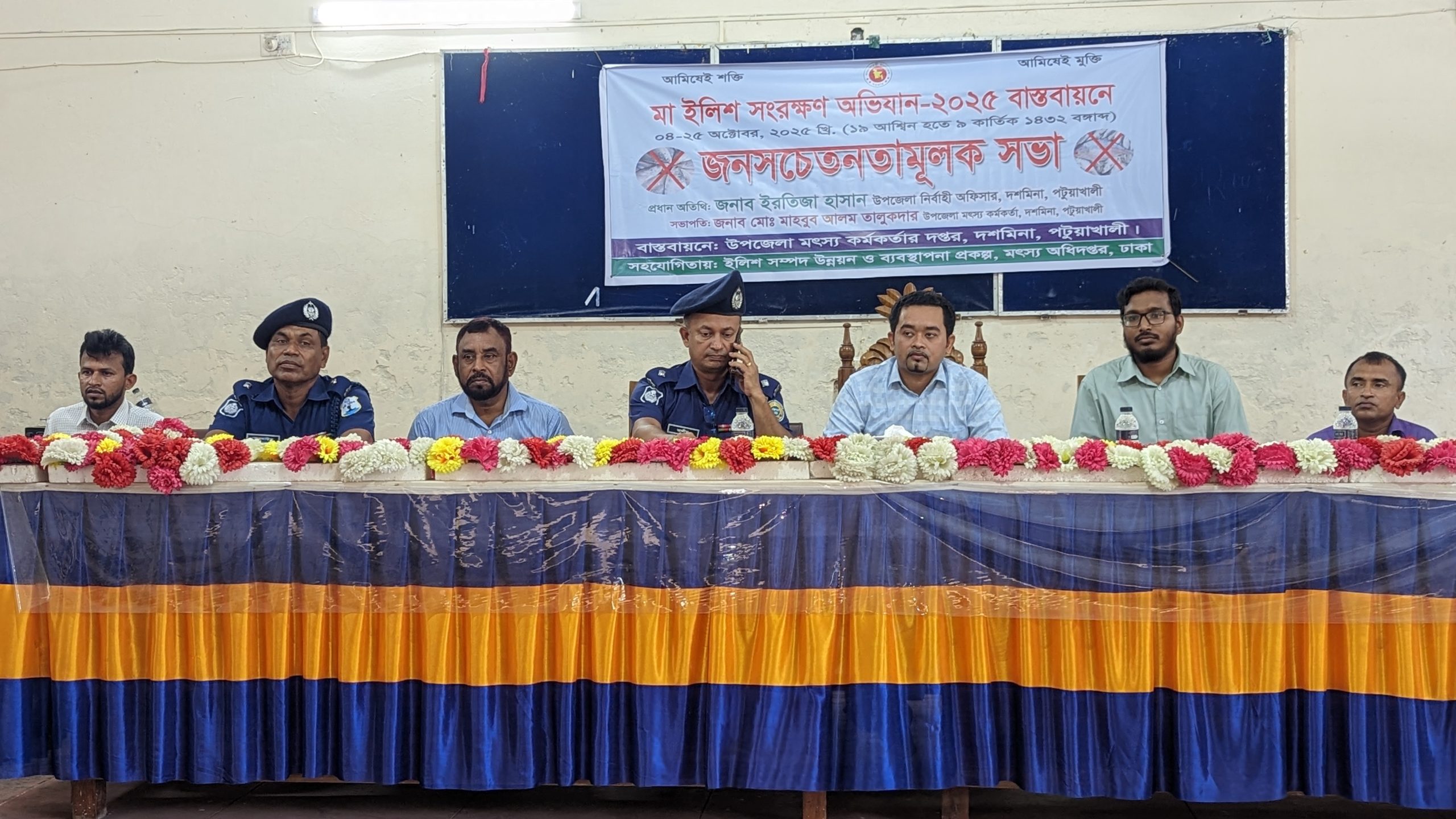 মোঃ বেল্লাল হোসেন, দশমিনা: পটুয়াখালীর দশমিনা উপজেলা মৎস্য দপ্তরের আয়োজনে মঙ্গলবার (৩০ সেপ্টেম্বর) দুপুর ১২ টায় মা-ইলিশ সংরক্ষণে জনসচেতনতামূলক সভা অনুষ্ঠিত হয়েছে। উপজেলা মৎস্য কর্মকর্তা মো. মাহাবুব আলম তালুকদার এর সভাপতিত্বে প্রধান অতিথি হিসাবে উপস্থিত ছিলেন উপজেলা নির্বাহী কর্মকর্তা (ইউএনও) ইরতিজা হাসান।