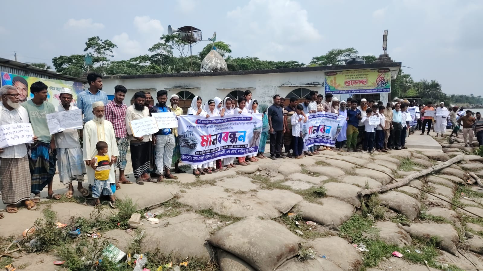 রবিবার (২৬ এপ্রিল) সকাল ১০টার দিকে নদীর তীরবর্তী ঝুঁকিপূর্ণ এলাকায় এই মানববন্ধনের আয়োজন করা হয়। এতে অংশ নেন বিভিন্ন শ্রেণি-পেশার মানুষ, শিক্ষার্থী, জনপ্রতিনিধি ও সামাজিক সংগঠনের সদস্যরা।
