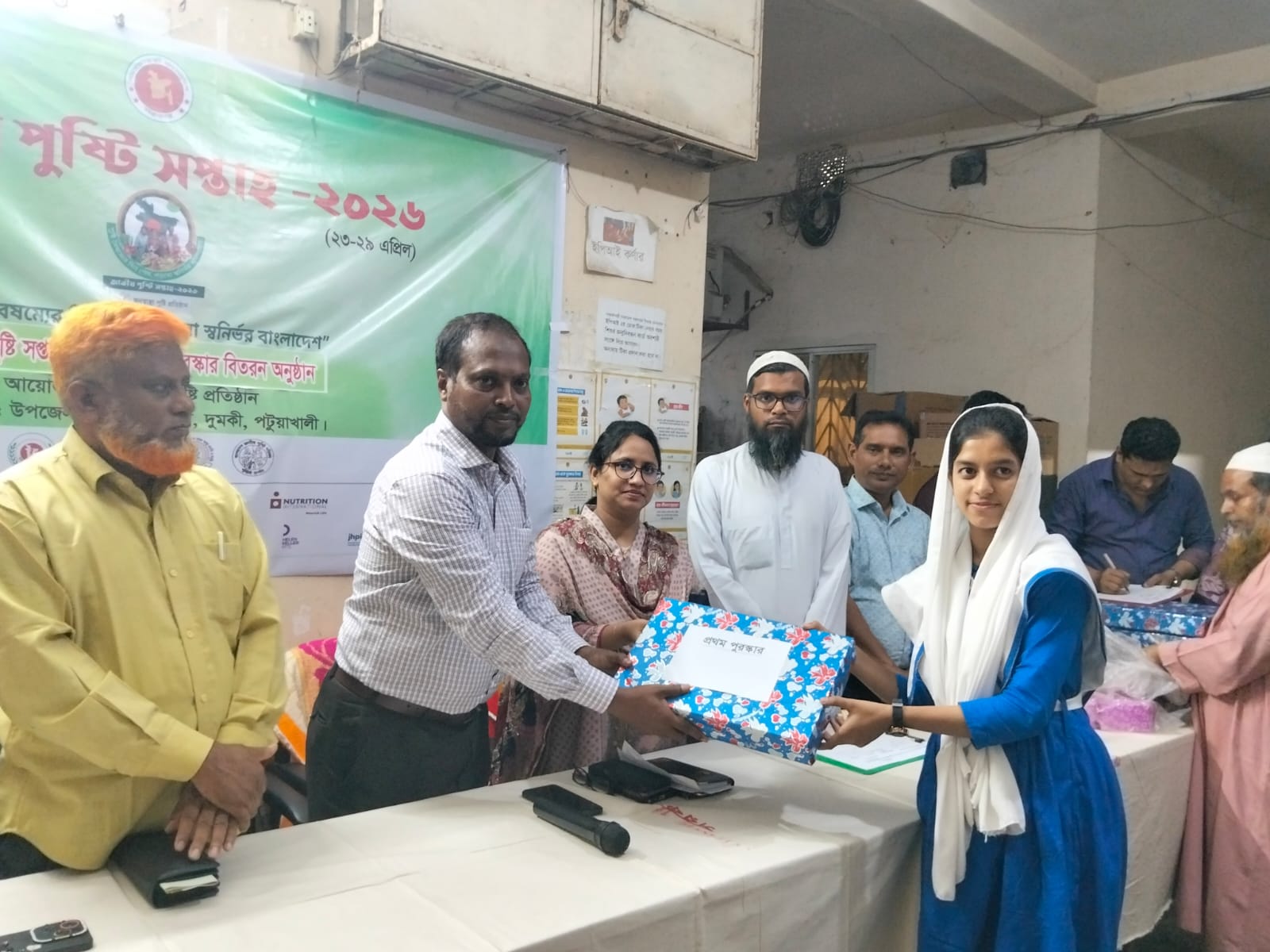 দুমকি প্রতিনিধি: পটুয়াখালীর দুমকিতে জাতীয় পুষ্টি সপ্তাহের সমাপনী ও বিজয়ীদের মধ্যে পুরস্কার বিতরন অনুষ্ঠিত হয়েছে।