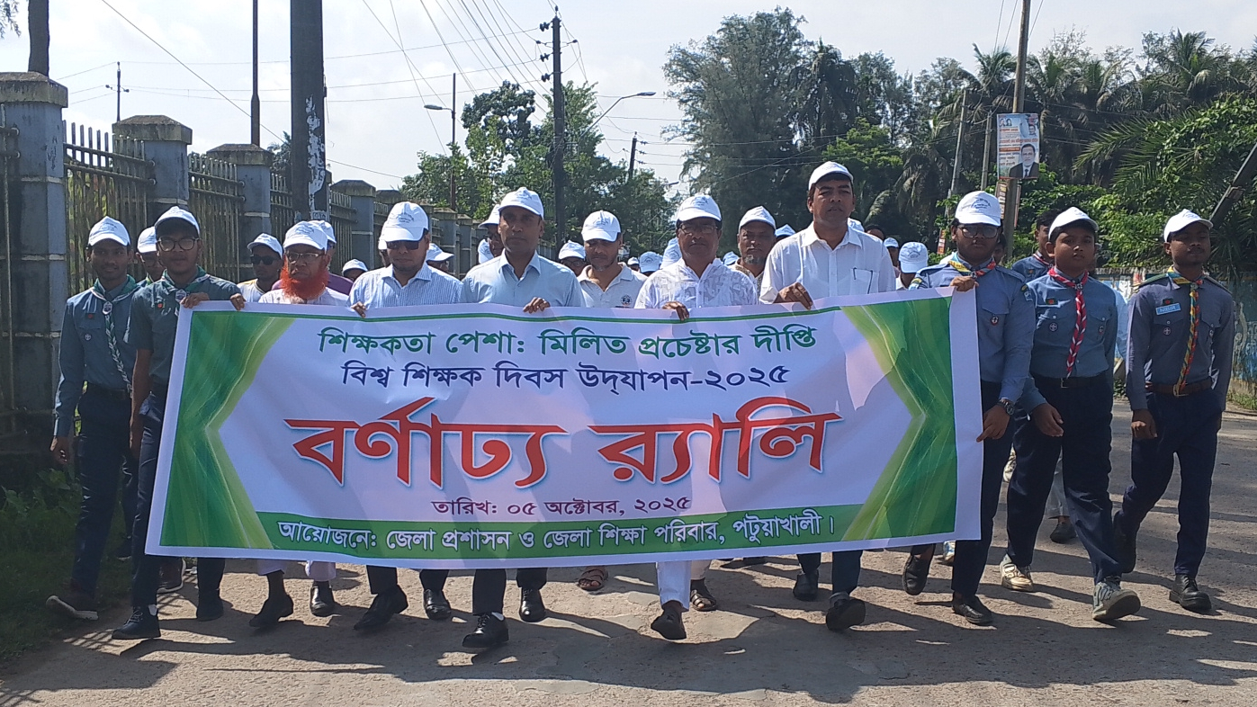 ‘শিক্ষকতা পেশা: মিলিত প্রচেষ্টার দীপ্তি’ স্লোগানকে সামনে রেখে পটুয়াখালীতে বর্ণাঢ্য র্যালী ও আলোচনা সভার মধ্যে দিয়ে বিশ্ব শিক্ষক দিবস উদযাপন- ২০২৫ পালিত হয়েছে। রবিবার (০৫ অক্টোবর) সকাল সাড়ে ৯ টায় জেলা প্রশাসন ও জেলা শিক্ষা পরিবারের আয়োজনে পটুয়াখালী সার্কিট হাউস থেকে একটি র্যালী বের হয়ে শিল্পকলা একাডেমিতে এসে শেষ হয়। পরে পটুয়াখালী শিল্পকলা একাডেমি মিলনায়তনে এক আলোচনা সভা অনুষ্ঠিত হয়।