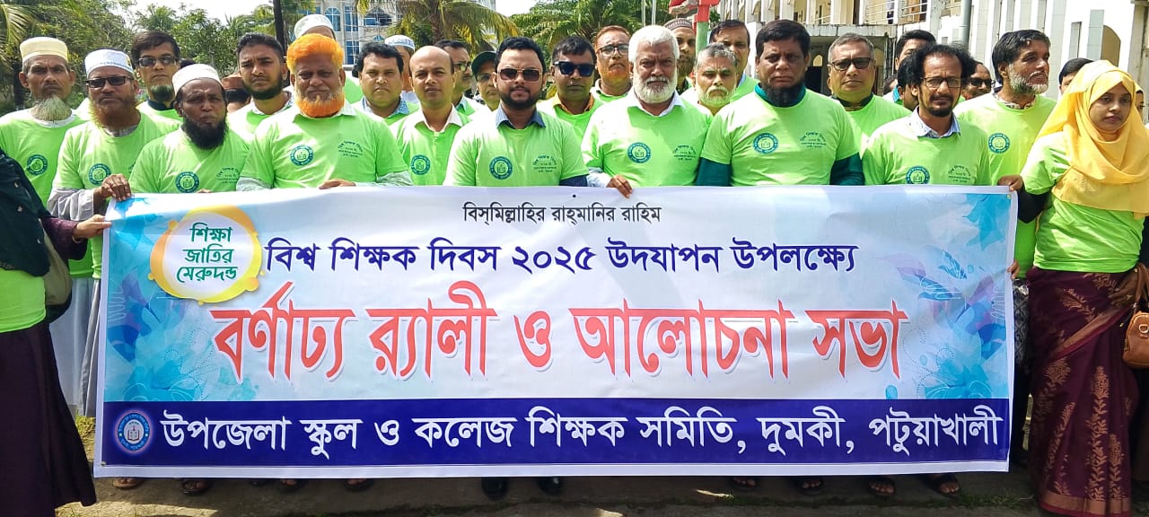 মোঃ জসিম উদ্দিন, দুমকি: ‘বিশ্ব শিক্ষক দিবস’ উপলক্ষে পটুয়াখালীর দুমকিতে উপজেলা স্কুল ও কলেজ শিক্ষক সমিতির আয়োজনে এক বর্ণাঢ্য র্যালি ও আলোচনা সভা অনুষ্ঠিত হয়েছে। শিক্ষাবিদ, শিক্ষক নেতা এবং প্রশাসনের কর্মকর্তাদের অংশগ্রহণে দিনটি ছিল উৎসবমুখর।